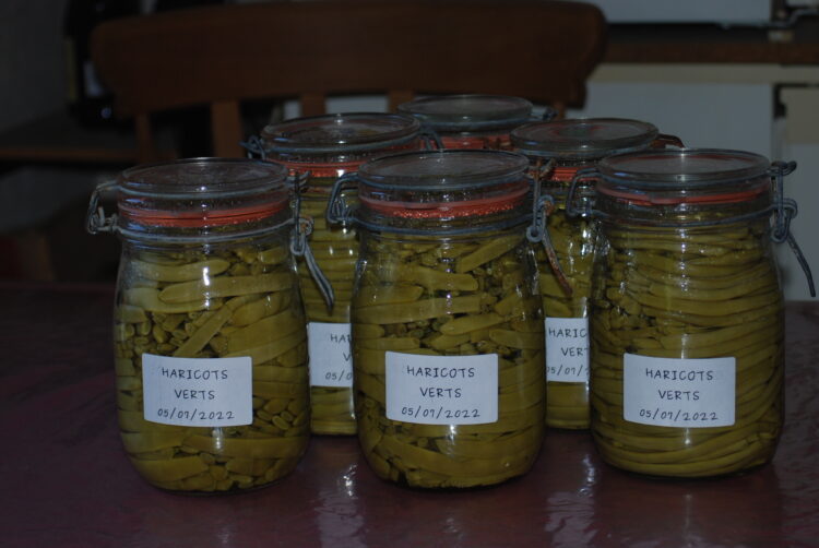 Au mois de juillet, j’ai fait mes premiers bocaux d’haricots verts, ma méthode préférée pour ces légumes. Je fais aussi des bocaux de tomates concassées, du coulis, de la ratatouille et des soupes, et même des ragoûts. Je fais des cornichons au vinaigre et parfois je fais des betteraves rouges cuites que je conserve dans un vinaigre doux ou je les fais crues en lacto-fermentation accompagnées de carottes ou pas.