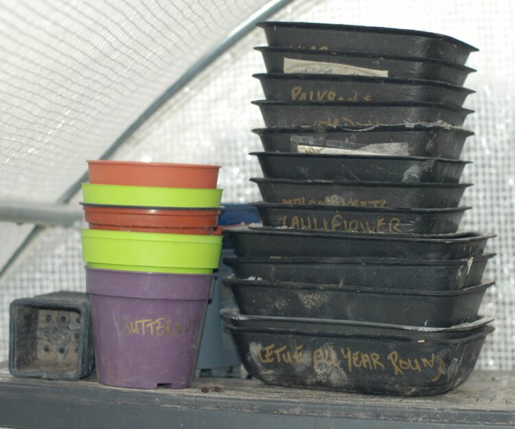 J’utilise beaucoup de barquettes pour faire mes semis avant de pouvoir transplanter mes petits plants en pots individuels. Je préfère les barquettes en polystyrène fin. J’ai eu accès à celles en polystyrène plus épais récupérées en poissonnerie, mais je ne les ai pas trouvées aussi résistantes. Les contenants transparents utilisés pour les viennoiseries, sont fabriqué avec un plastique un peu fin et il faut donc faire attention en les utilisant. Sinon ils sont pratiques pour faire des micro-serres avec leur couvercle intégré. Les barquettes en plastique, comme celles utilisées pour les fruits, peuvent également être utilisées pour les semis. Il est important de choisir des barquettes profondes (d’au moins 5-6 cm) et de faire des trous dans le fond pour le drainage.
